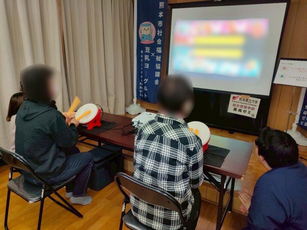今回は、太鼓を叩くリズムゲームを行いました。体験している方も待っている方も笑顔で楽しそうに活動している姿がとても印象的でした。