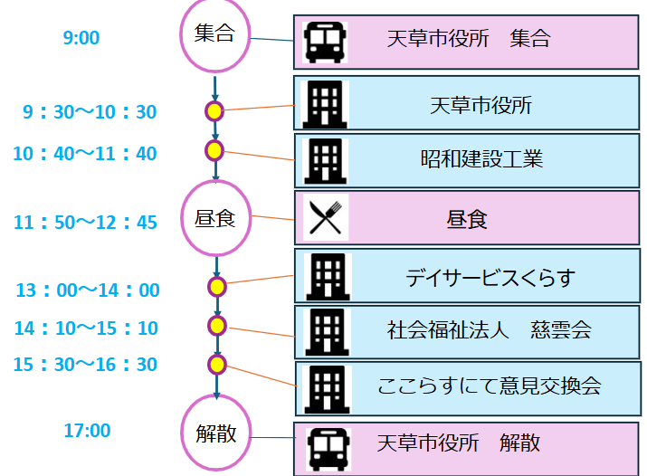バスツアー参加企業が確定しました!参加企業は、天草市役所・昭和建設工業株式会社・デイサービスくらす・特別養護老人ホーム慈晃園・天草金融金庫(訪問順)となります!参加企業が確定しましたので、参加高校生募集のフライヤーを作りました。たくさんの応募を待ってます!