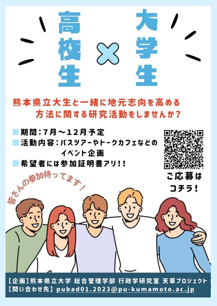 天草プロジェクトを行うにあたり、高校生スタッフを募集しています!天草市出身の方だけではなく、県内の高校生も大歓迎です!天草プロジェクトに興味がある方は下のチラシのQRコードからぜひ応募してください!