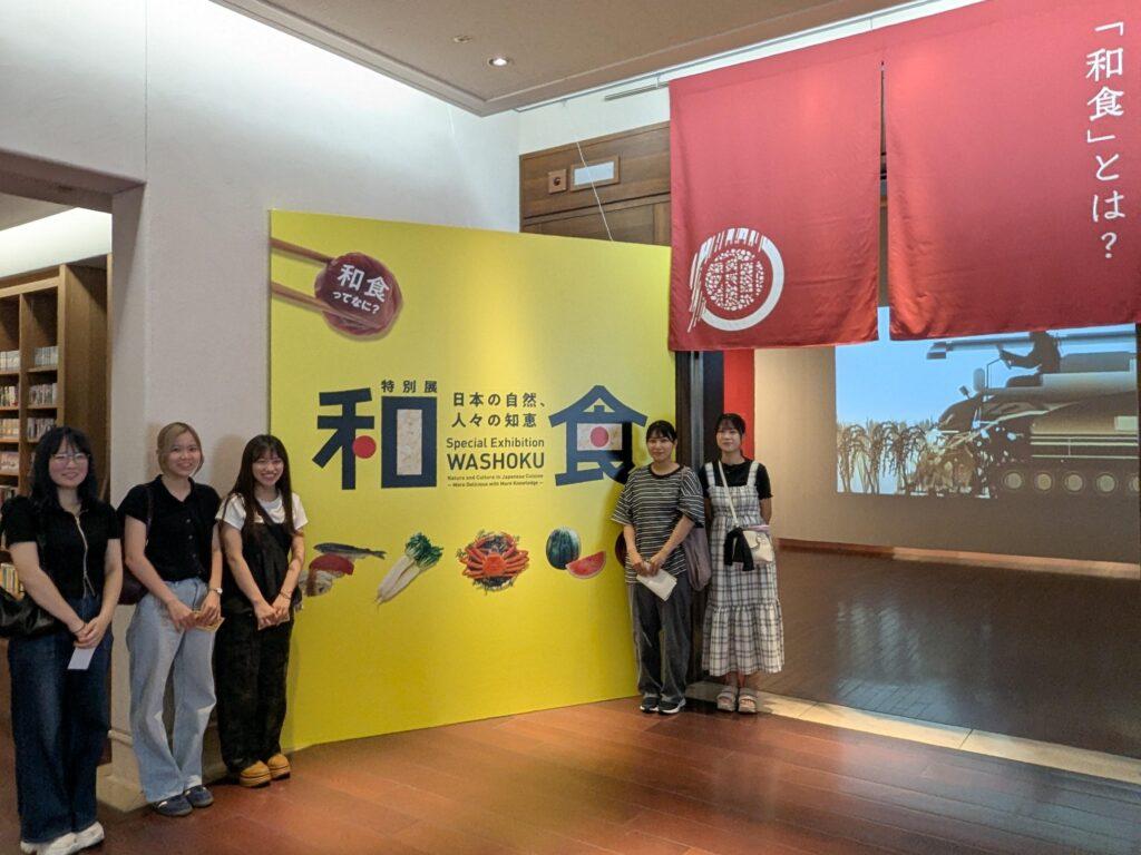 熊本市現代美術館で開催されている特別展「和食~日本の自然、人々の知恵~」の見学を行いました。和食に関わる様々な食材や料理のレプリカが揃っていました。江藤家の献立に実際に含まれていた食材を発見することができたり、盛り付け方や皿の配置、皿のデザインや料理の写真の撮り方、QRコードを用いた献立再現の伝え方など、参考にできそうなアイデアを得ることができました。