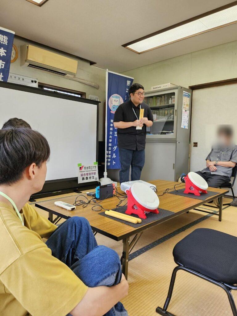 今回は、リズムよく太鼓を叩くゲームを実施しました。初めてされる人が多かったですが、皆さん上手にかつ楽しく太鼓を叩かれておられました。私たちのサポートいらずの太鼓の上手さに圧倒されました。