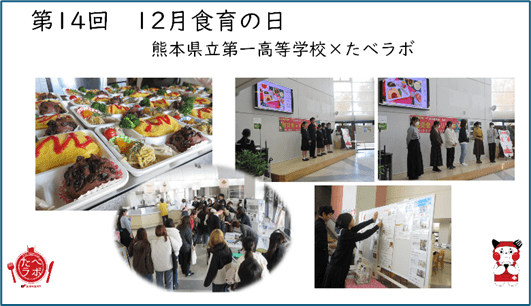 テーマは「防災食×クリスマスwith熊本県立第一高等学校」。初の進学高校とのコラボ企画。当日は、高校生のメニュー紹介や大学生のリレートーク、ローリングストックの野菜ジュースを配布し、クリスマスメニューを通して防災食について考える企画となった。