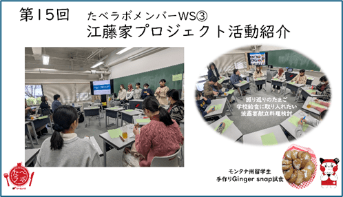 地域連携型学生研究で大津町の旧家の昭和初期婚礼献立の再現を行っている江藤家プロジェクトメンバー(たべラボメンバー)による活動紹介を実施した。献立の翻字から調理再現までこれまでの取り組み紹介後、振り返りのたまごによる学校給食に取り入れたい披露宴献立料理を検討した。
