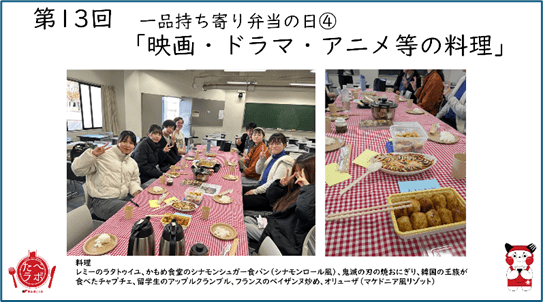 後学期2回目となる一品持ち寄り弁当の日を実施した。映画やドラマなどで登場した料理を再現して持ち寄り味わいながら交流した。