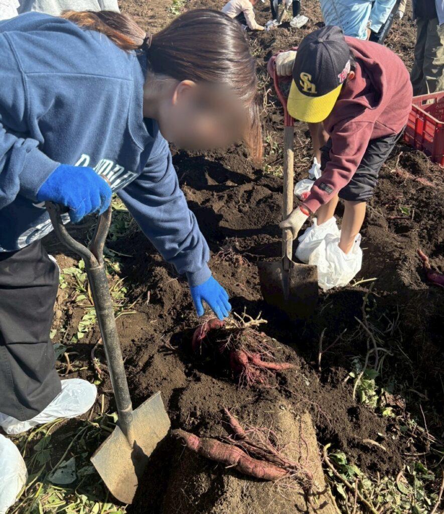 11月15日に、寺子屋に参加する子どもたちと芋掘りとBBQしました。芋掘りには地域の方々や保護者の方々にも参加していただき、皆んなで協力しながら沢山のさつまいもを掘ることができました。BBQでは、地域の方々がたくさんのお肉や野菜をご用意してくださり、豚汁やつみれ汁、お漬物まで作ってきてくださいました。晴れた空の下、外で談笑しながら食べる豚汁は本当に美味しかったです。最後は、採れたさつまいもを焼き芋にして食べました。私たち学生は、会場の設営やBBQでお肉を率先して焼くなどのお手伝いをさせていただきましたが、子どもたちが喜んでいる姿を見ると、頑張った甲斐があったなと感じ、とても嬉しかったです。今回は普段より長く、深く、子どもたちや地域の方々と関わることができ、とても楽しい一日を過ごすことができました。