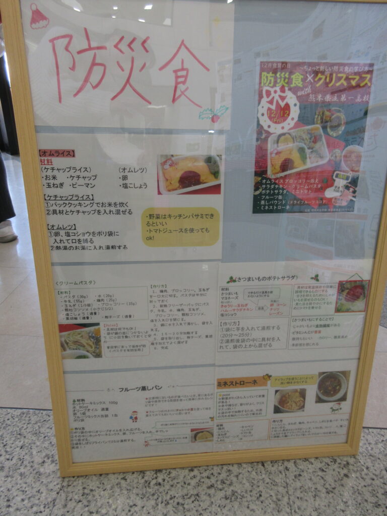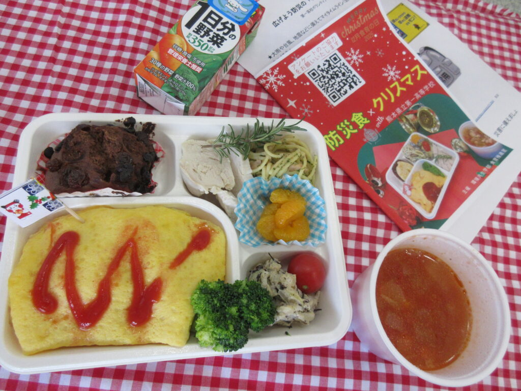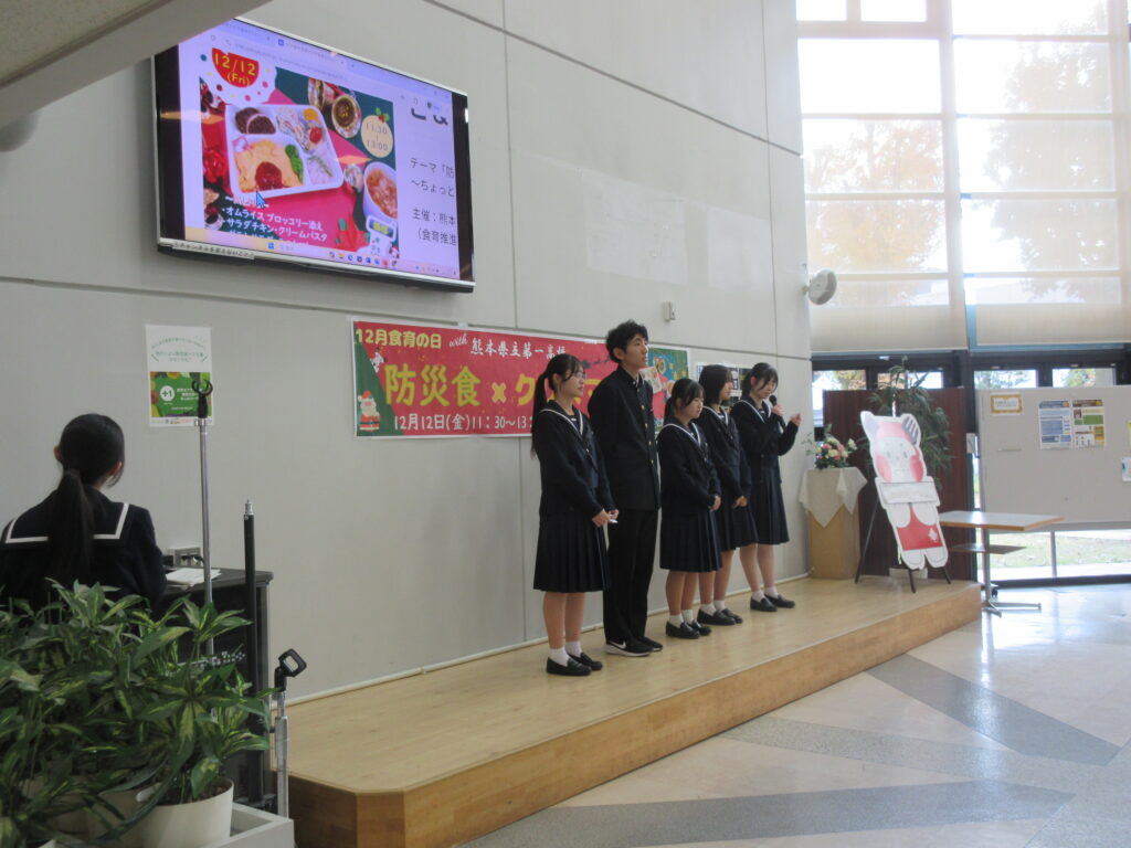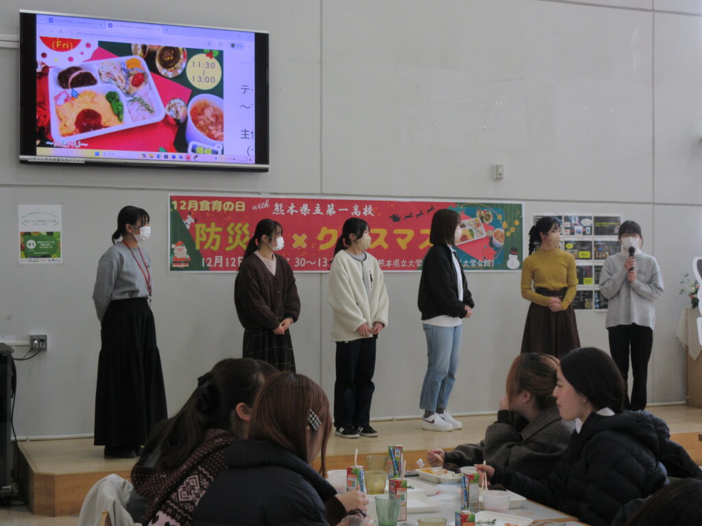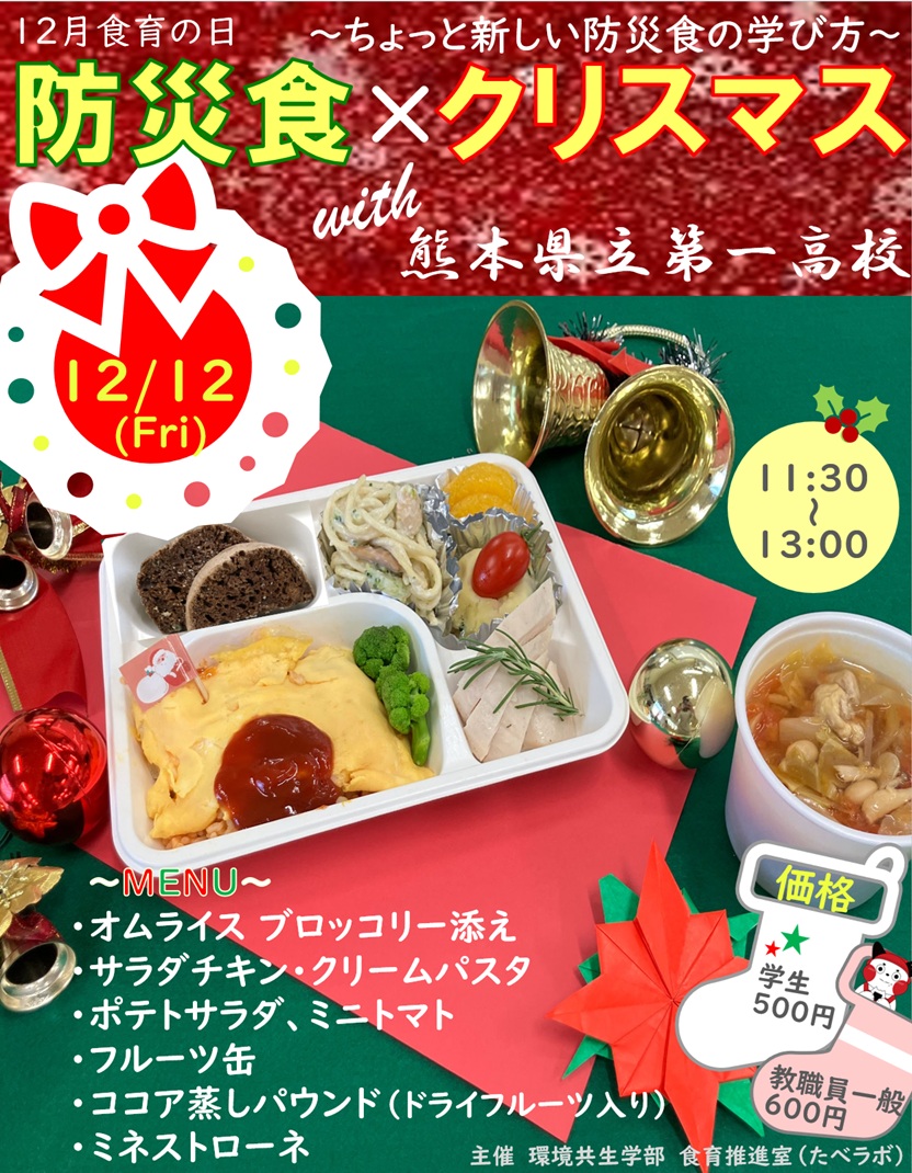 12月の食育の日は「防災食×クリスマスwith熊本県立第一高等学校」と題して、高校生と大学生が協働で”防災”を意識して考案したクリスマス料理を提供しました!今回は初の第一高校家庭クラブとの高大連携企画となりました。