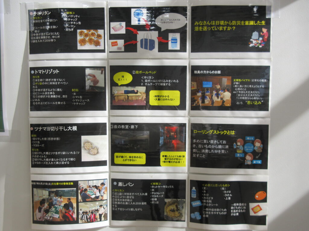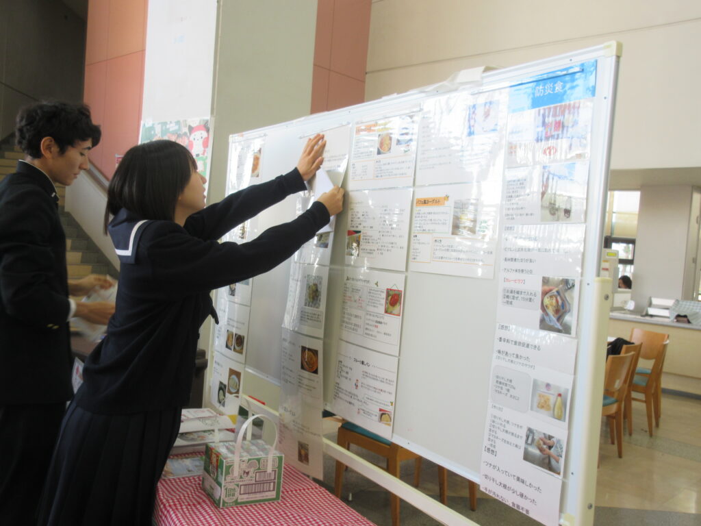 当日は第一高校生がレシピとチラシ、野菜ジュースを手渡しで提供。また、掲示用のレシピや防災に関する知識をまとめたポスターも持参して情報提供をしてくれました!