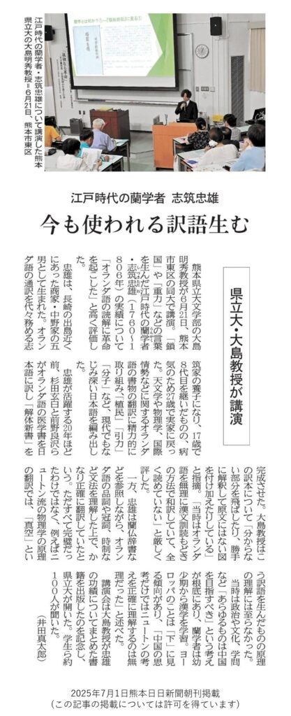 令和7年6月21日(土)に開催された熊本県立大学公開講演会『人物叢書 志筑忠雄』出版記念講演会「孤独なる革命-天才蘭学者・志筑忠雄の生涯と仕事-」が熊日新聞に掲載されました。