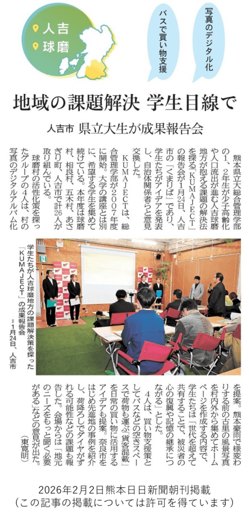 KUMAJECT2025報告会は、熊日新聞2026年2月2日付で取り上げられていますので、下記の記事もご参照ください。