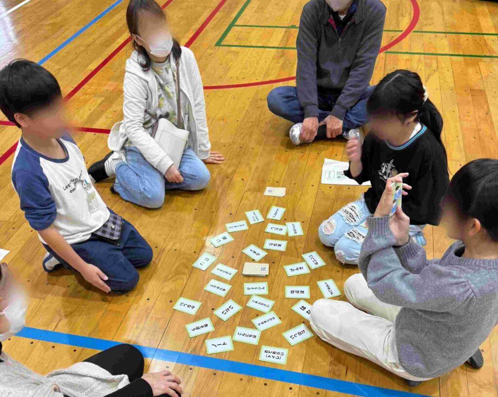 2月27日に、月出小学校の子どもたちと一緒に手話かるたをしました。授業参観の時間をお借りして、保護者の方々にも見守られながら、楽しく手話を学びました。今回は2年生のゼミ生も活動に参加しました。手話かるたを広める活動は2回目で、前回は教室で1クラスの子どもたちに教える形でしたが、今回は体育館で1学年全員の子どもたちとその保護者の皆様を対象に活動を行ったため、私たちにとって新たな挑戦でした。大勢の方々をまとめる不安もありましたが、民生委員の方々の協力もあり、しっかりと場を仕切ることができました。子どもたちは手話を覚えるのがとても早くて、子どもたち同士でカードを取り合う姿が非常に印象的でした。保護者の方々にもお子様の隣に入って参加していただき、親子で楽しむ様子が見受けられ、とても嬉しかったです。このような活動を後輩たちにしっかりと引き継ぎ、今後も手話かるたを広めていけるように務めていきたいと思います。