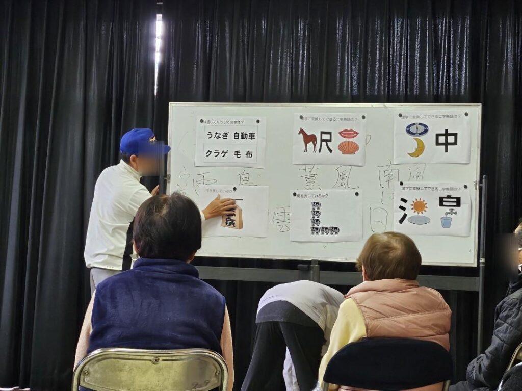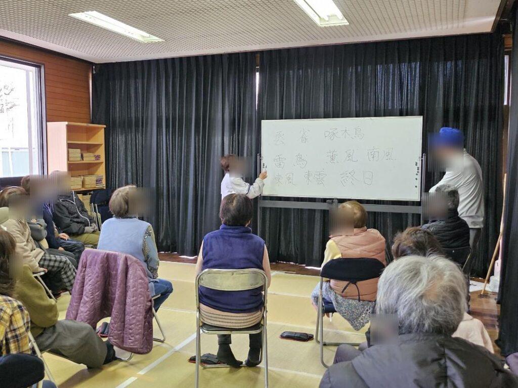 普段のサロン活動は何をされているのか、集会所の規模感はどの程度なのかなど、青春繋輪を開催する上で必要なことを知るために伺いました。活動としては、九州のお城で替え歌された曲をみんなで歌唱することから始まり、難読漢字の読みや脳トレのクイズで頭を使い、重りを腕や足につけて体を動かし、最後に室内モルックをチーム対抗で盛り上がる2時間でした。