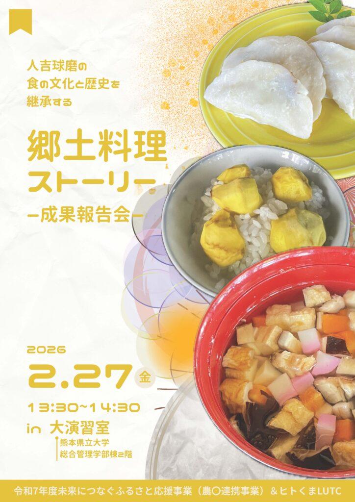 熊本県の「令和7年度未来につなぐふるさと応援事業(農〇連携事業)」の助成を受けて実施した「人吉球磨の食の文化と歴史を継承する郷土料理ストーリー」成果報告を学生が行います。