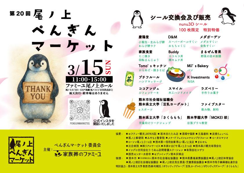 2026/02/21 その他 第20回ぺんぎんマーケットが開催されます 尾ノ上ぺんぎんマーケットは、地域の子どもの居場所づくり、多世代交流を図るため、隔月で開催されています。総合管理学部西森ゼミの学生も、eスポーツ(豆乳ヨーグルト)やワークショップ(さくらもち)で参加します。ぜひ、ご家族みなさんで遊びにいらしてください。 \ この記事をシェアする! / facebook X