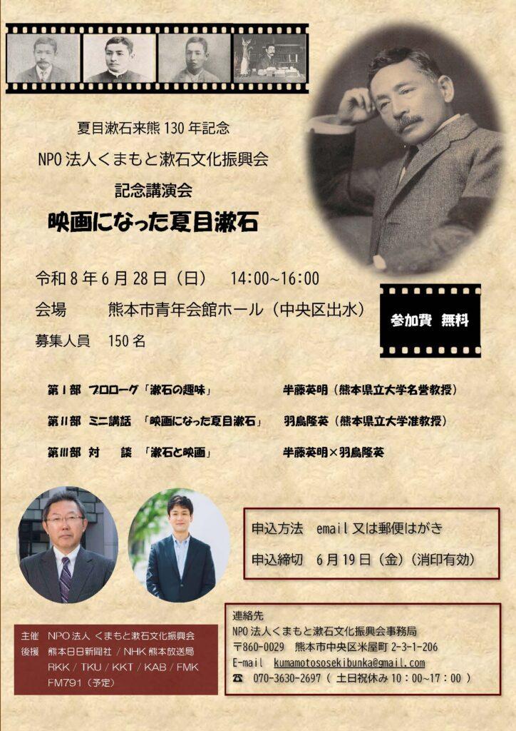 本学名誉教授半藤英明先生が理事長を務められるNPO法人くまもと漱石文化振興会主催で、夏目漱石来熊130年記念講演会「映画になった夏目漱石」が開催されます。
