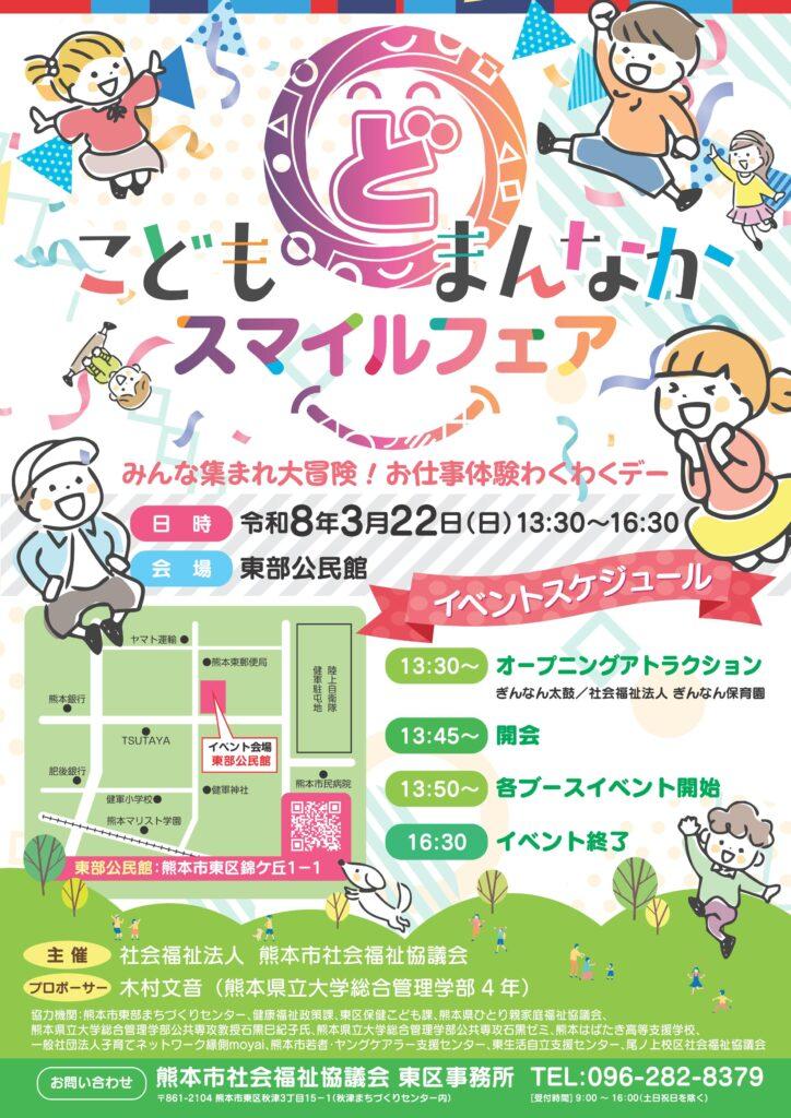 2026/03/05 その他最新情報 県大生が考案!こども〔ど〕まんなかスマイルフェアが開催されます!! 本学総合管理学部石黒ゼミの学生が考案した【こども ど まんなかスマイルフェア】が下記のとおり開催されます。その企画を実現するため、当日は、総合管理学部松本ゼミ、西森ゼミの学生が多数参加します。ぜひ、お誘いあわせのうえ、遊びにいらしてください。 \ この記事をシェアする! / facebook X